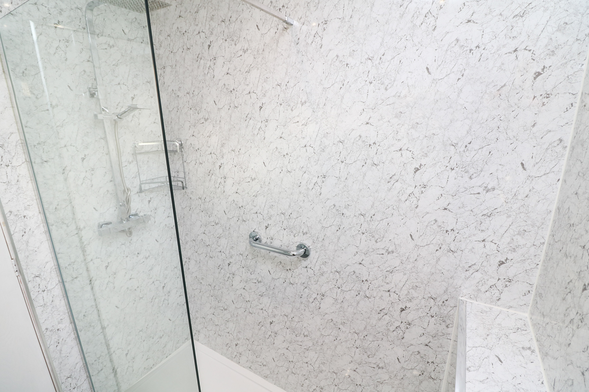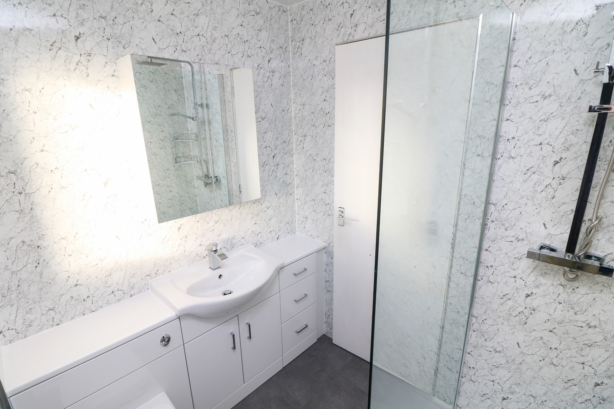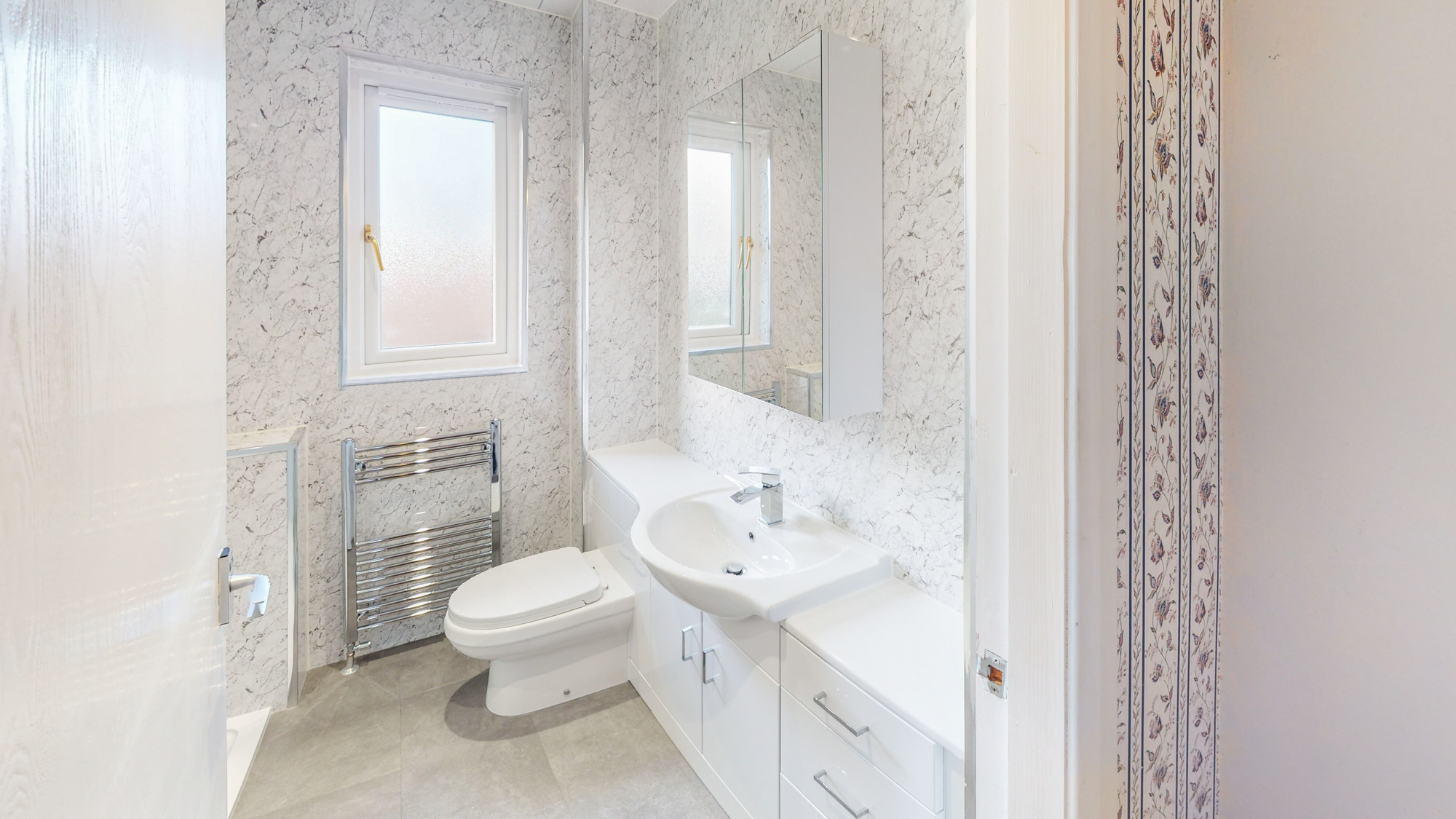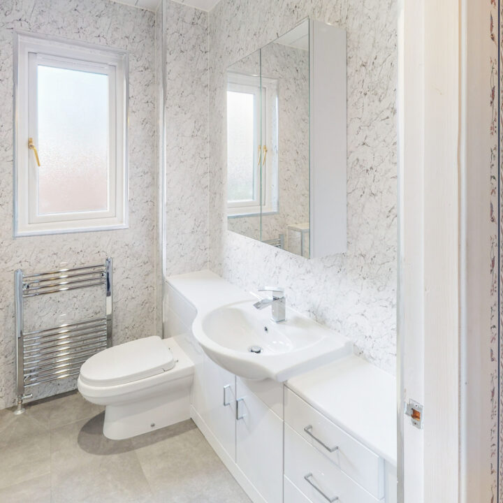 On the upper level are three bedrooms. Two double sized with inbuilt storage and one single sized also with inbuilt storage. Completing the accommodation on offer is an impressive, refurbished shower room with walk-in glass shower cubicle, white suite and vanity unit. Wall panelling provides a fresh and spacious aspect.