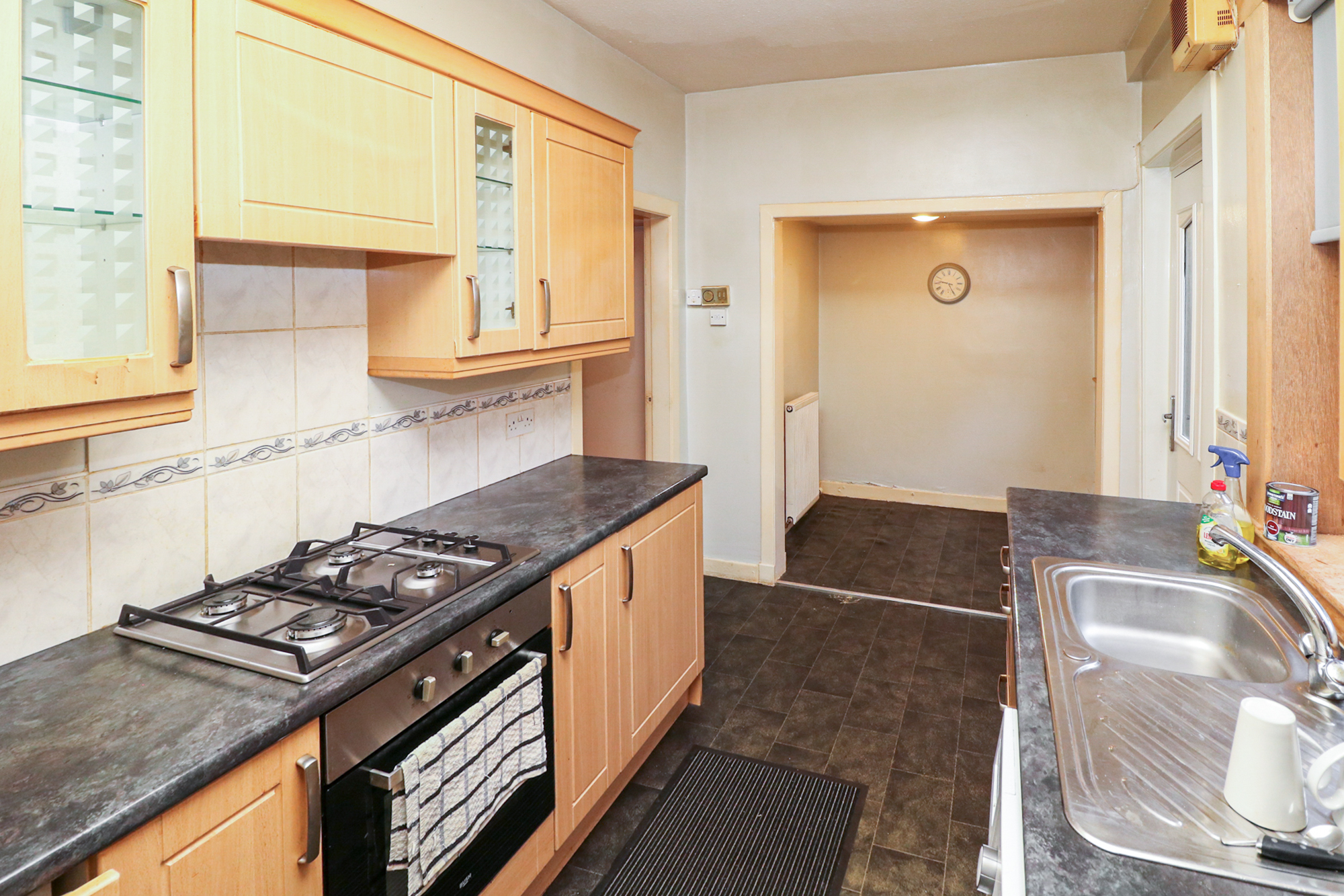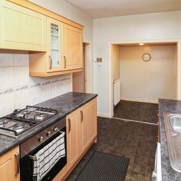 The living room leads naturally into the fully fitted kitchen, including integrated oven, hob, fridge and freezer, and space for a table and chairs for breakfast and informal meals. The kitchen also benefits from direct access to the rear garden via the back door.