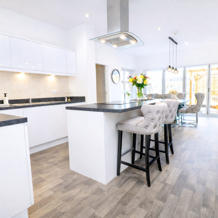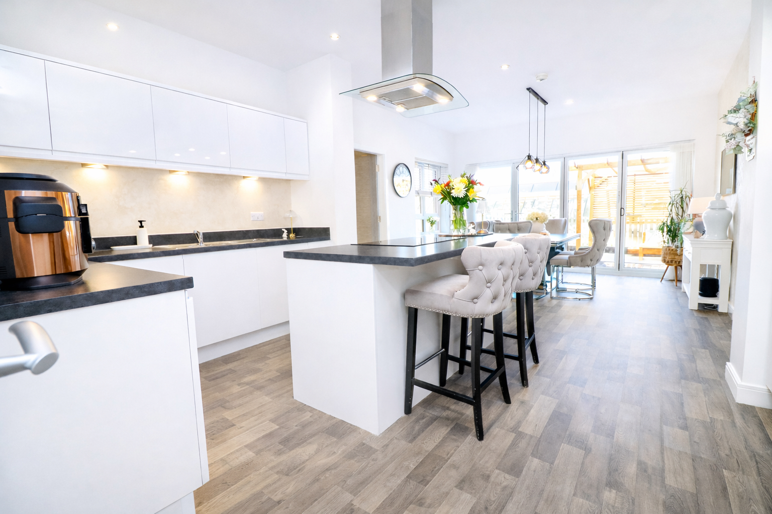 On entering the property, you are immediately drawn to the super design and style of this stunning home. The high ceilings give an incredible feeling of space, and the inviting hallway leads to a comfortable living room with French doors leading to the privacy of the rear garden. An undoubted highlight in this wonderful home is the spacious dining kitchen/family room with bi-fold doors leading to the patio area and gardens. The impressive kitchen is complete with an array of contemporary base and wall mounted units with contrasting worktops, central island and a range of Zanussi integrated appliances. A larger style utility room and downstairs WC complete the lower level accommodation.